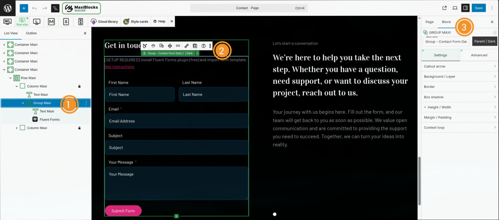 - Select the Group Maxi block (not the Fluent Forms block inside it)