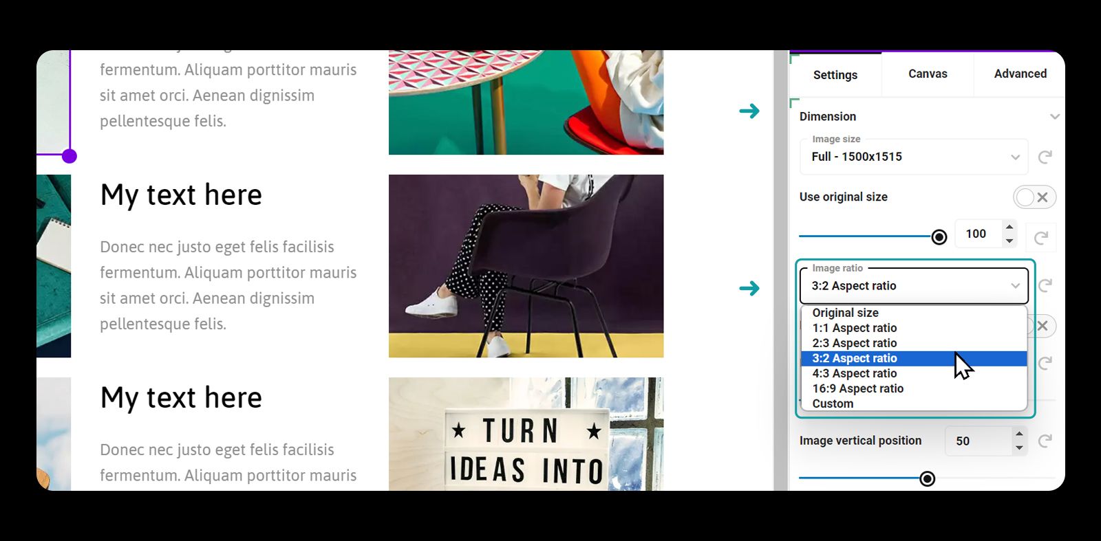 To make all the images the same size. >> Select the image. >> Toggle open the dimension tab and select 3:2 image ratio