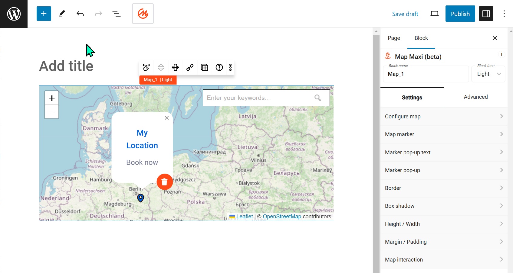 The Map Maxi block empowers you to embed interactive maps into your content, offering a wide range of customization options for map display, markers, and user interactions.
