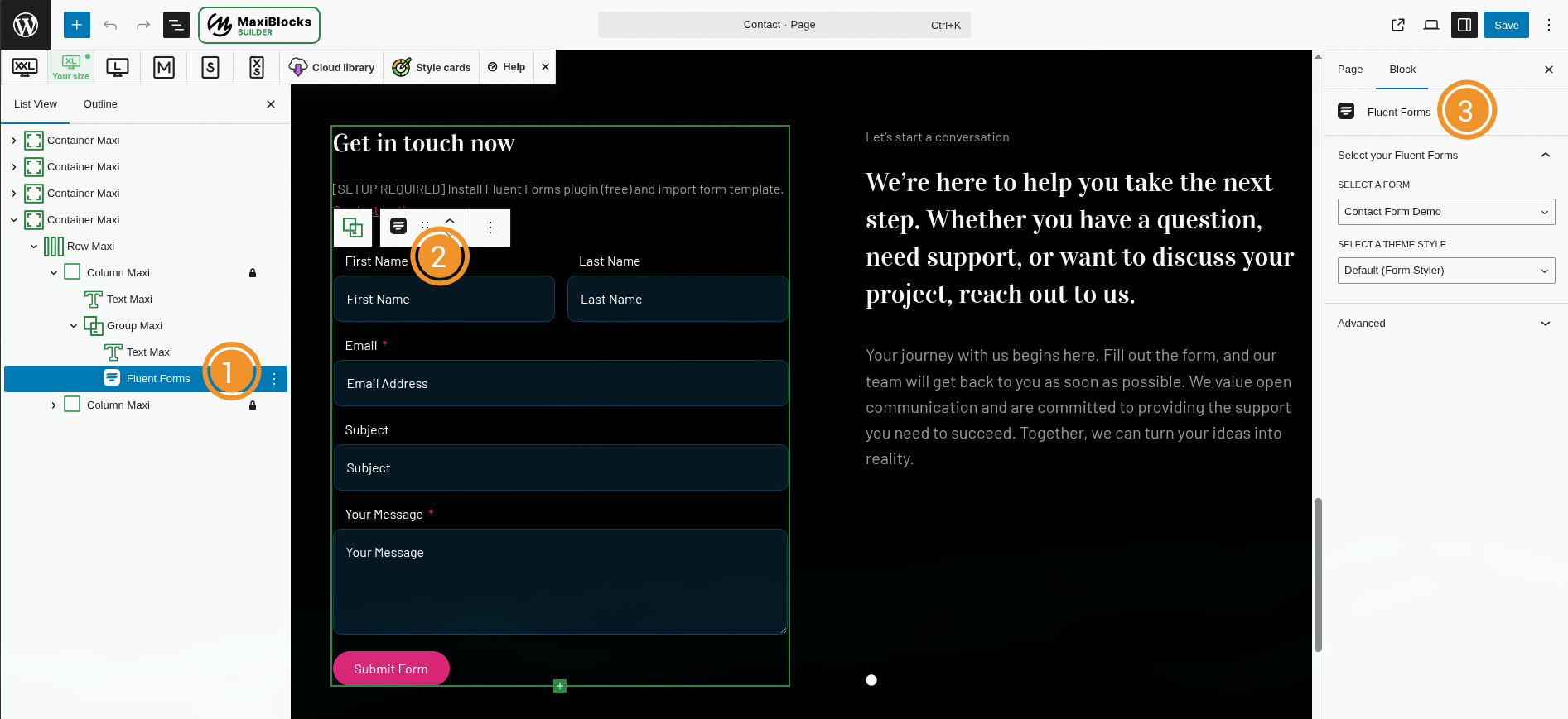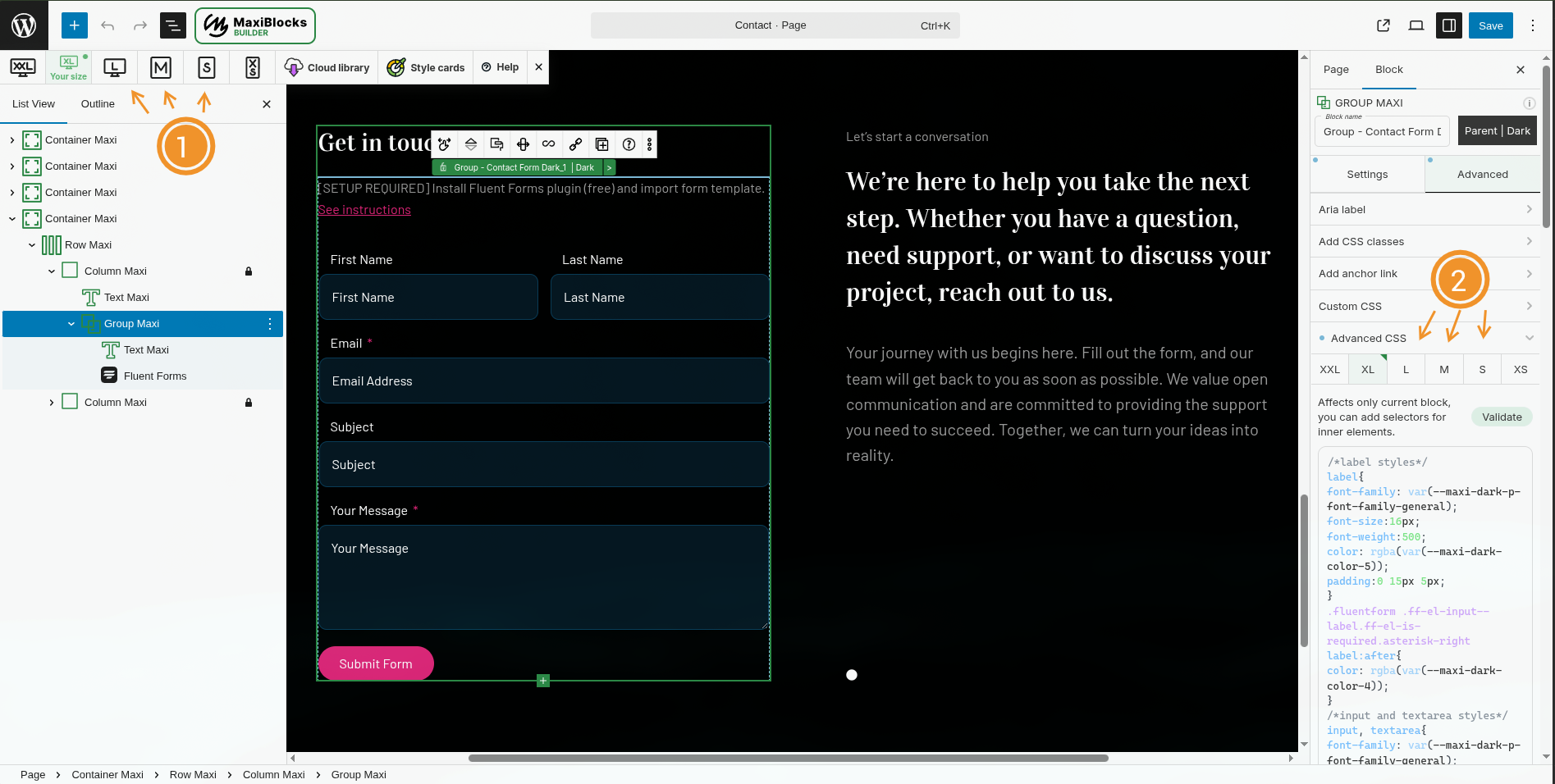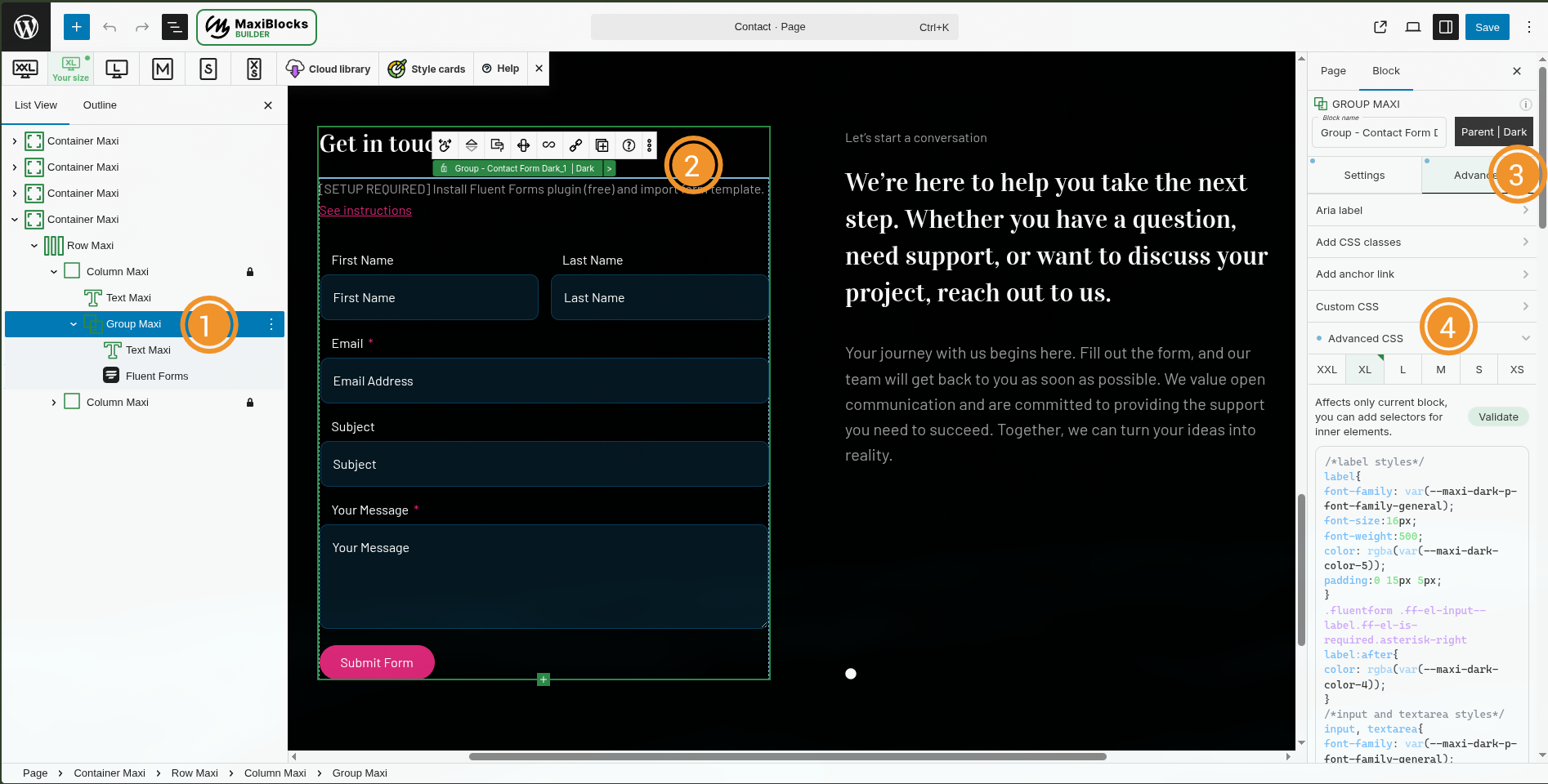 This guide explains how to style Fluent Forms within MaxiBlocks using the Group Maxi block's Advanced CSS functionality. This method ensures your form styles work with MaxiBlocks style cards and survive updates and style changes.