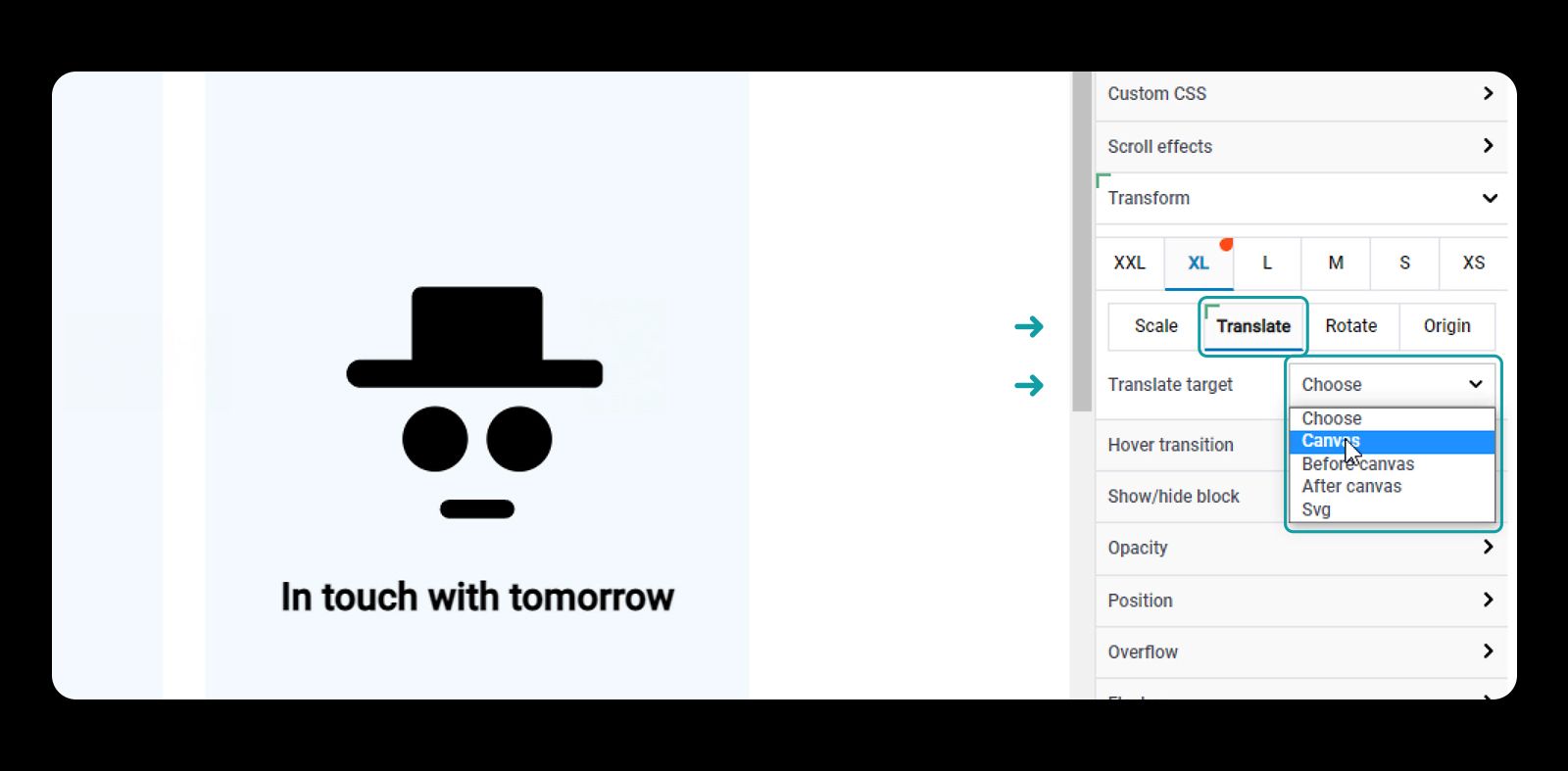 Toggle to 'Advanced' >> Select 'Transform' >> 'Translate' >> Choose the target canvas