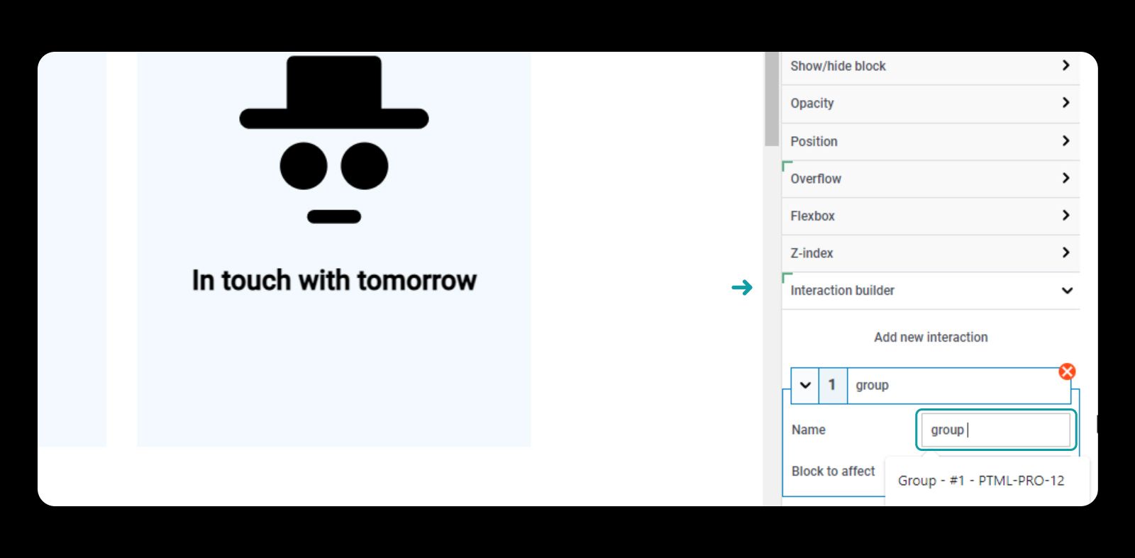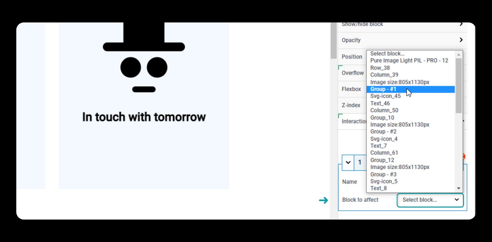 Next, choose the block you want to affect. From the dropdown menu select the block you want to add an interaction to. If you gave this block a custom name earlier, you will spot it here easily.