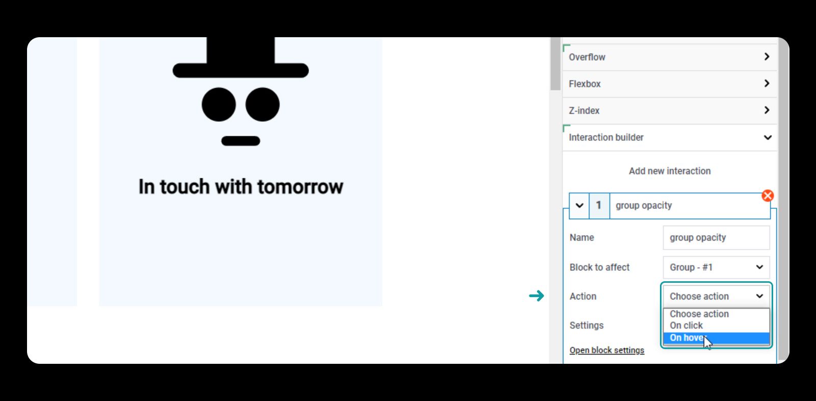 Finally, time to add the interaction itself! From the "settings" dropdown, choose what target block's settings you would like to affect. In our example, we want to choose the icon colour and change it to something other than the default one.