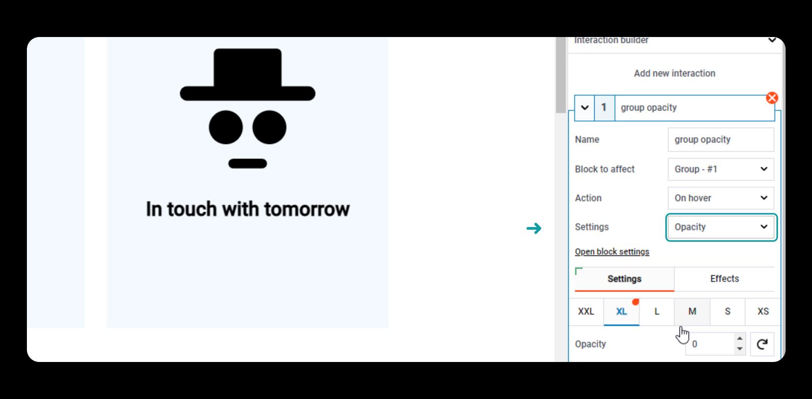 Select the setting to animate. In this case, set the opacity to 100 on hover
