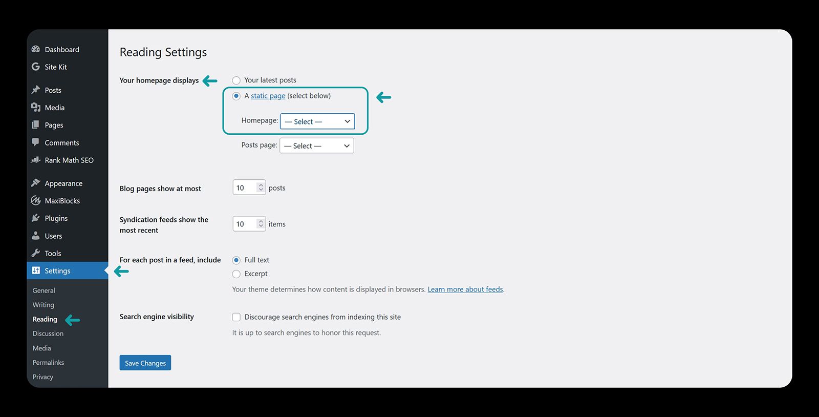From the WordPress administrator dashboard, navigate to Settings > Reading:
