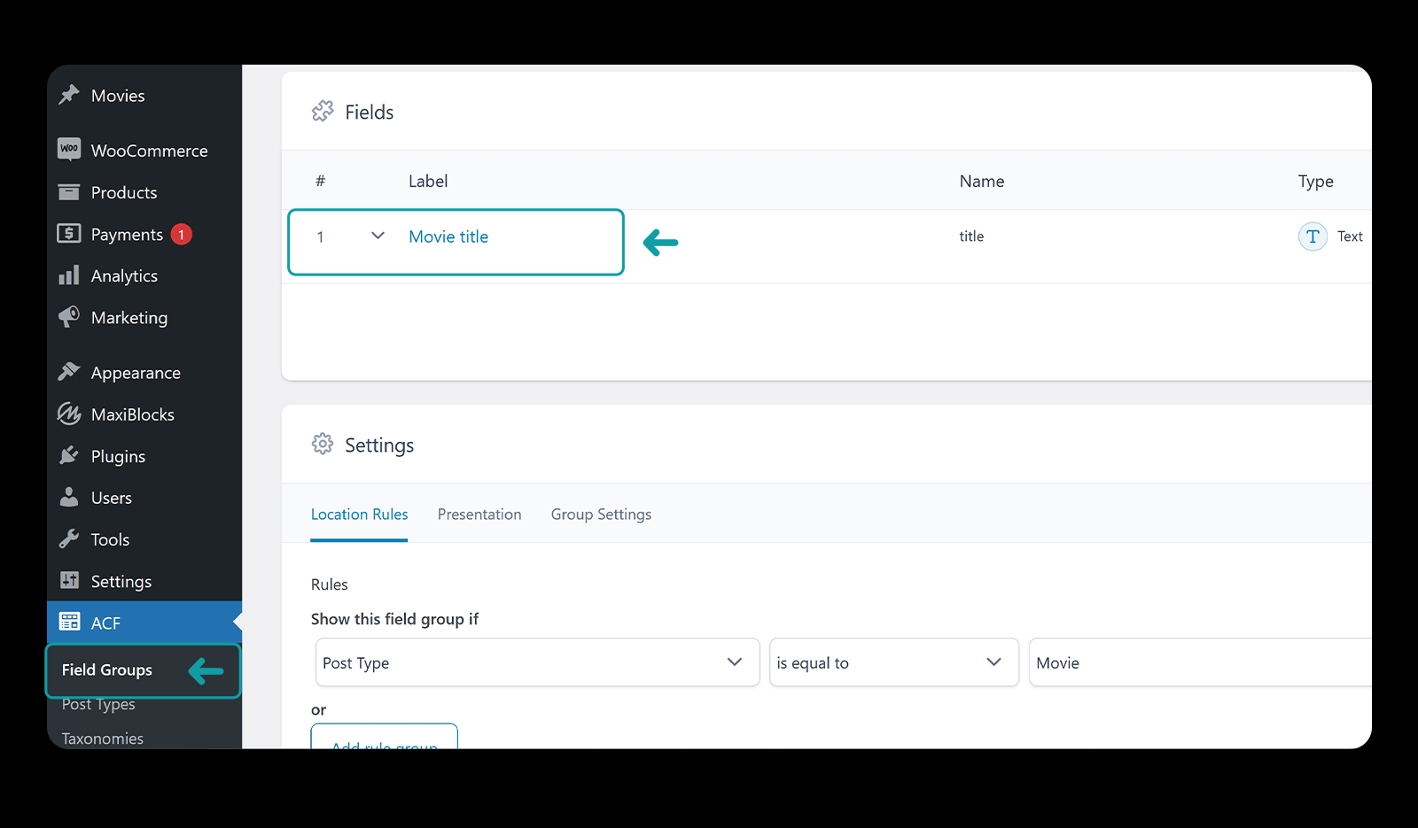 Start by creating a field group. Go to ACF > Field Groups and create a group:
