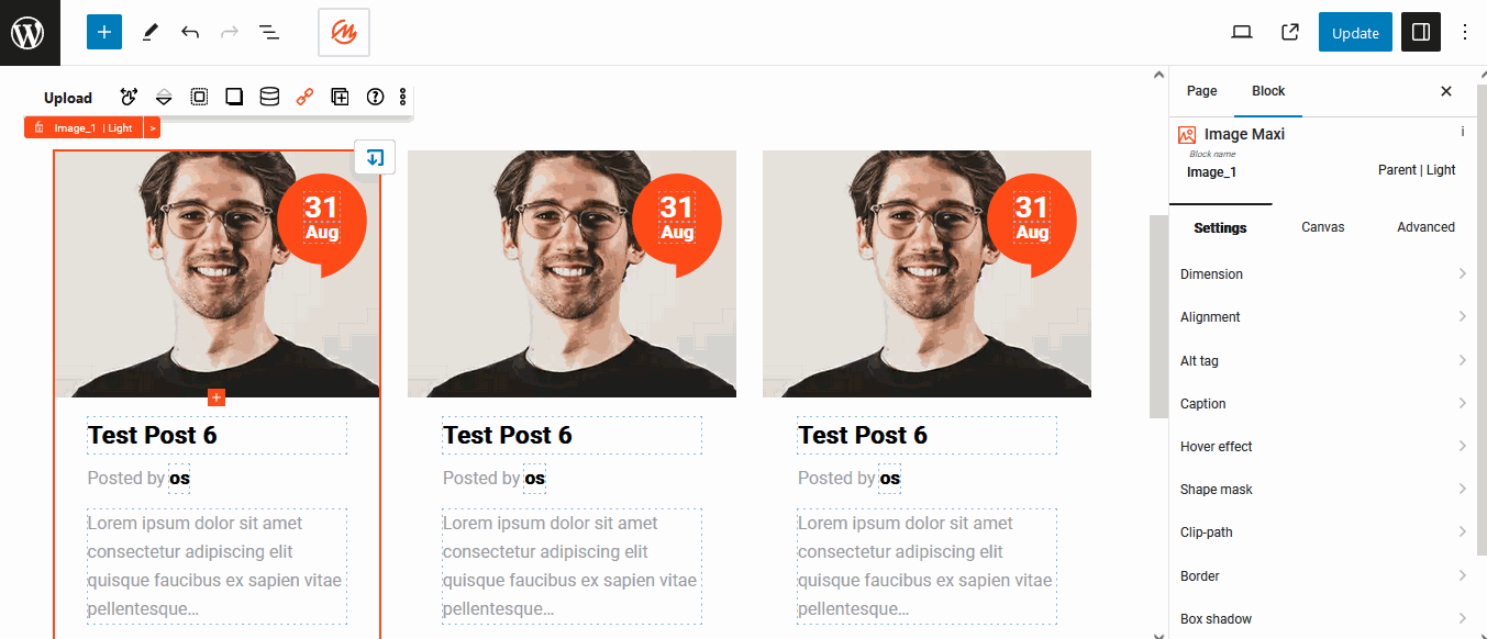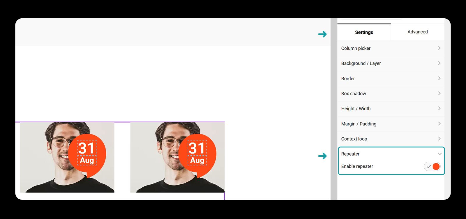 Finally, let's show the posts dynamically. Enable the context loop if it isn't already, and change the relation to date, for example. This will automatically get the blog posts by date.
