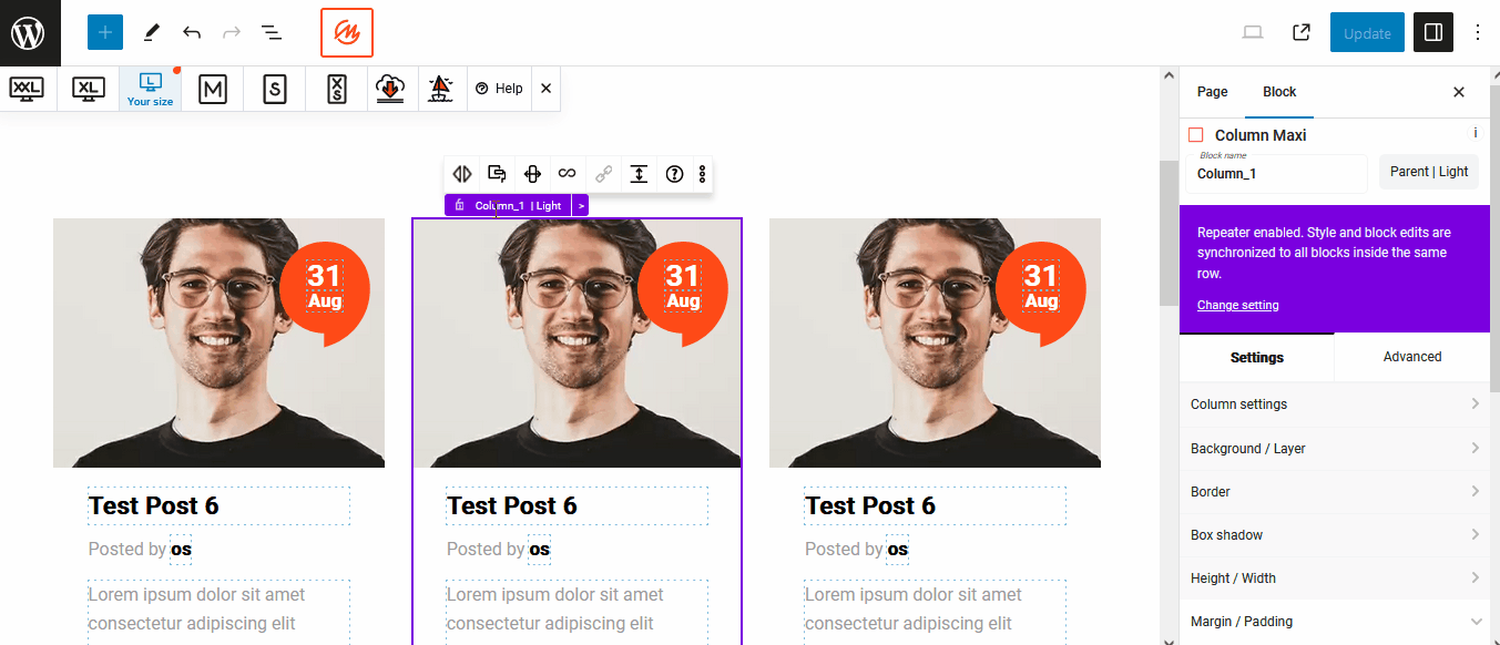 Select any column and change the width to 33.333. The repeater will repeat that step for all the other columns in the row and you will get a grid with 3 blog posts on a line.