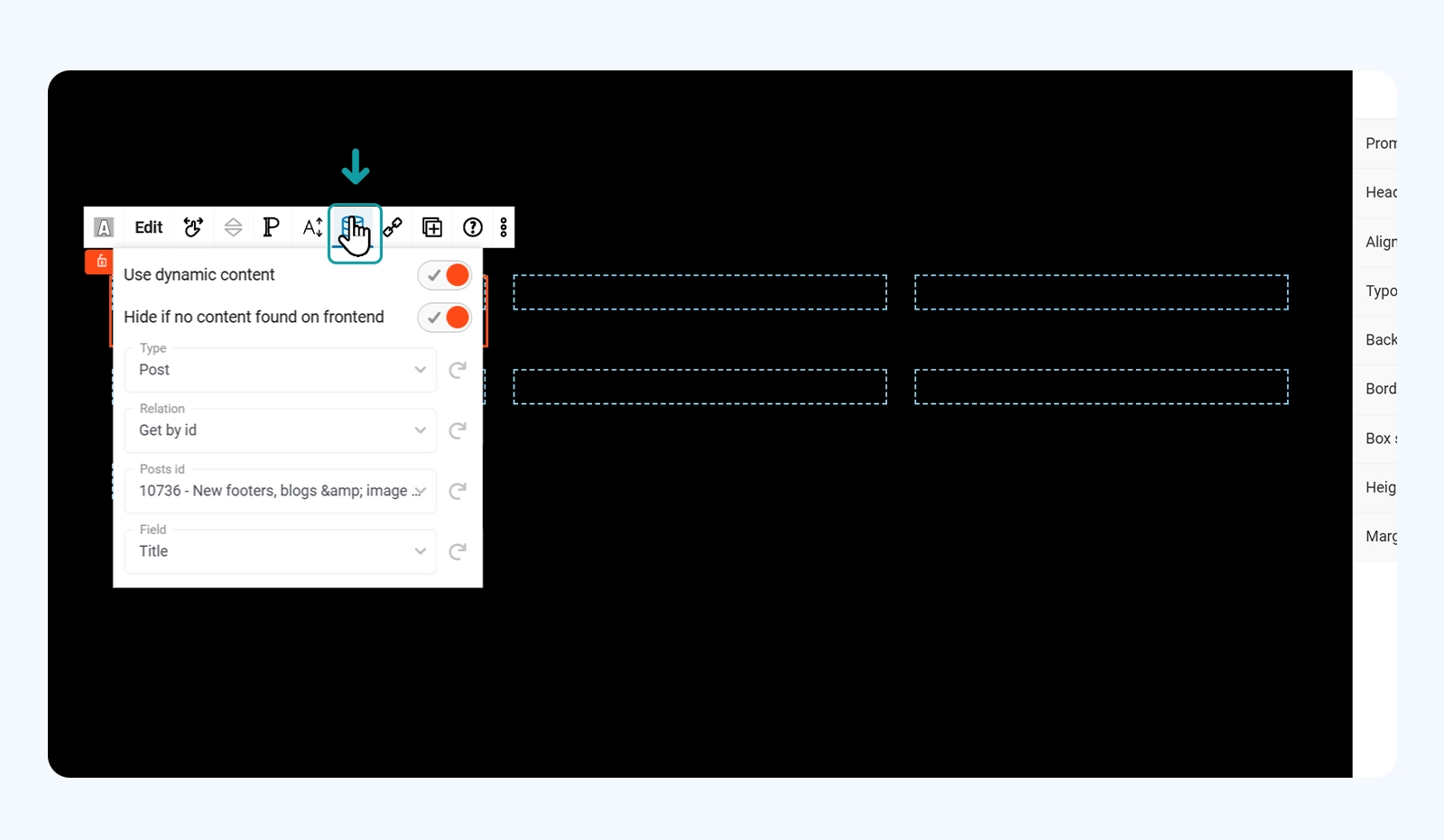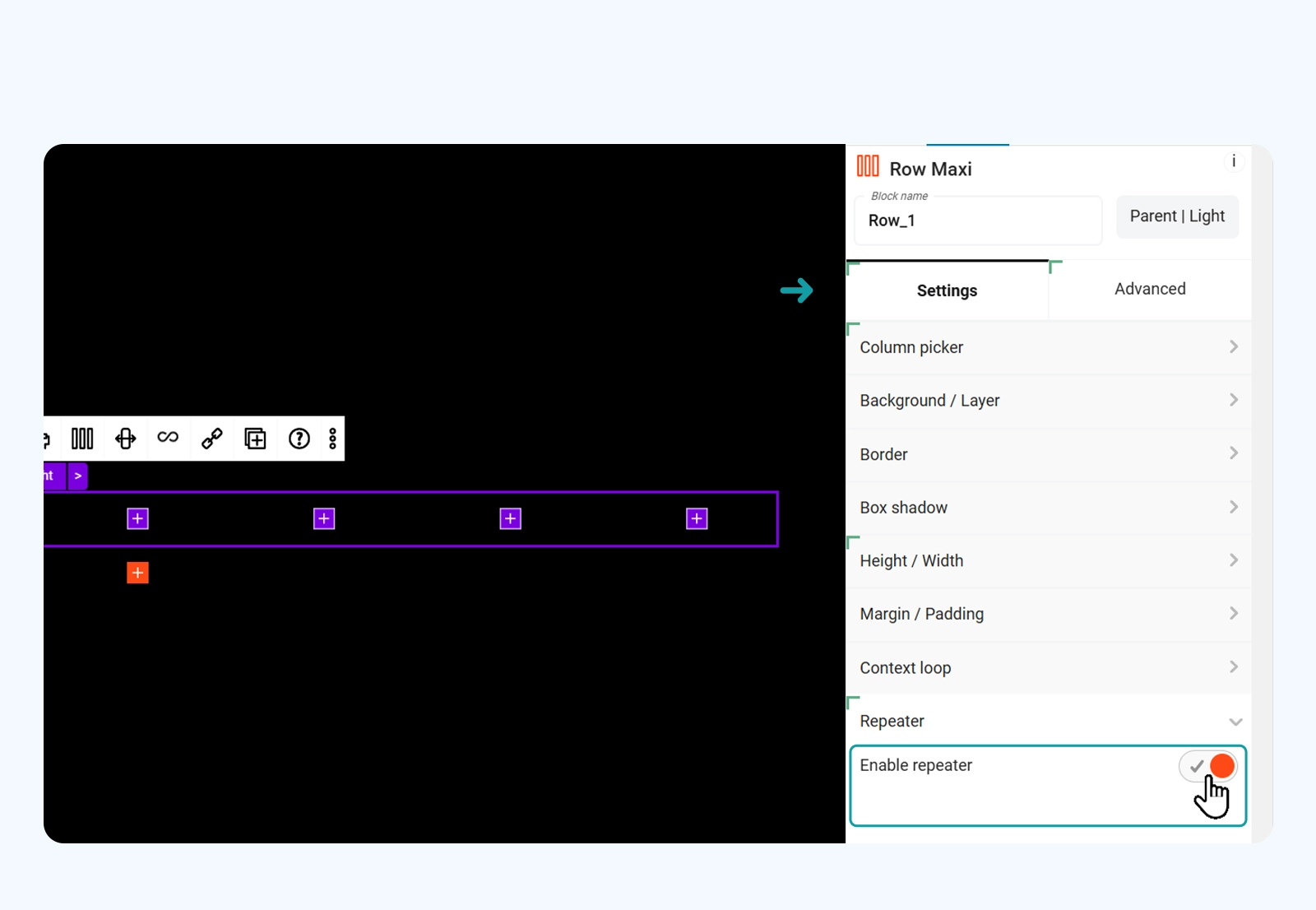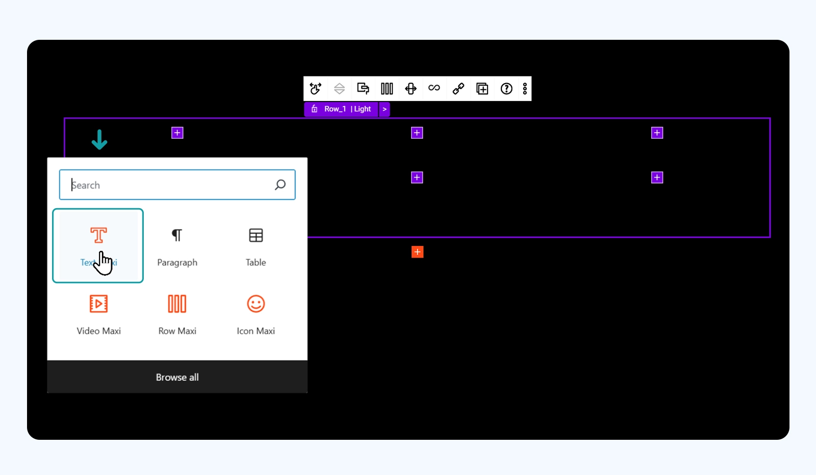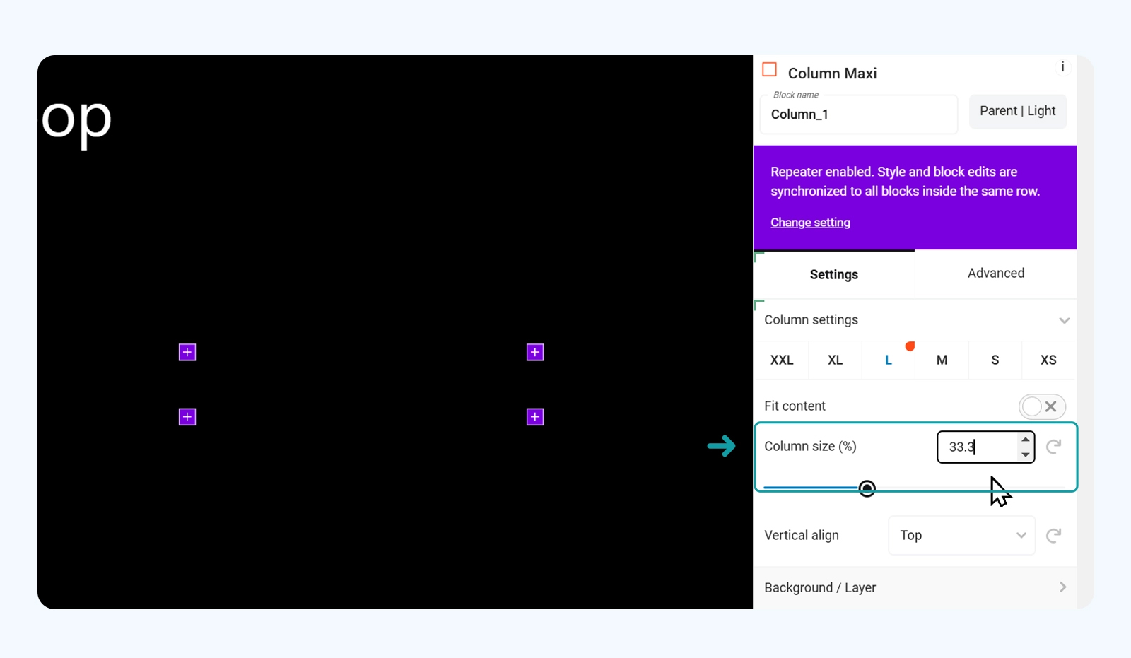 Now let’s fill this in with the content. Keep the repeater on to save time and insert the Text Maxi block inside the first column: